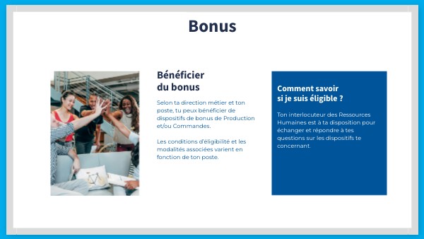Selon ta direction métier et ton poste, tu peux bénéficier de dispositifs de bonus de Production et/ou Commandes. Les conditions d’éligibilité et les modalités associées varient en fonction de ton poste.