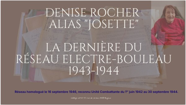 Au cours de nos recherches sur chaque membre du réseau, il est apparu la possibilité qu'un (e) agent (e) de liaison soit encore en vie. Nous avons cherché cette Agent (e) dont le pére, aussi membre d'Electre-Bouleau, fut arrêté à Lyon le 18 mai 1944 et Mort pour la France le 7 décembre 1944 en déportation à Flossenbürg (Allemagne) : il s'agit de Denise et Auguste ROCHER, alias Josette et José. Durant deux ans, nous avons pisté Denise! Nous l'avons enfin retrouvée à Saint-Etienne (Loire). Voici son histoire et celle des femmes et des hommes du réseau Electre-Bouleau au cours des années 1943-1944.