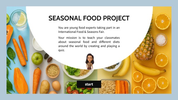 You are young food experts taking part in an International Food & Seasons Fair. Your mission is to teach your classmates about seasonal food and different diets around the world by creating and playing a quiz.