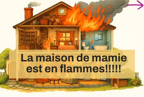 Après une longue journée de travail chez ta grand-mère, tu es très fatigué et tu décides de prendre un bain. Soudain tu sens la fumée. - Oh non!! Qu'est-ce qu'il y a? Tu regardes par la fenêtre et tu vois que le grenier a pris feu. Tout à coup, un grand courant d'áir vient attiser les flammes. Peu après, tu écoutes des claquements de portes. - Oh là là!!!! Toutes les portes de la maison se sont fermées avec le vent. Et la porte de la salle de bains aussi!!! Tu prends la poignée mais tu ne peux plus sortir. Tu as besoin de la clé. Tu paniques... Tu essayes de réfléchir mais le feu t'angoisse... mais tu te souviens que mamie avait des copies des clés de la maison partout. Tu pars à la recherche dans la salle de bains...