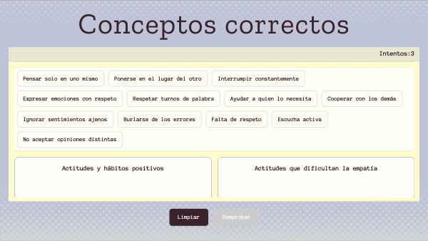 Has clasificado correctamente las actitudes empáticas y los hábitos positivos, diferenciándolos de aquellas conductas que dificultan la convivencia y el bienestar emocional.
