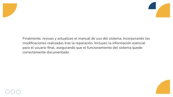 Finalmente, revisas y actualizas el manual de uso del sistema, incorporando las modificaciones realizadas tras la reparación. Incluyes la información esencial para el usuario final, asegurando que el funcionamiento del sistema quede correctamente documentado.