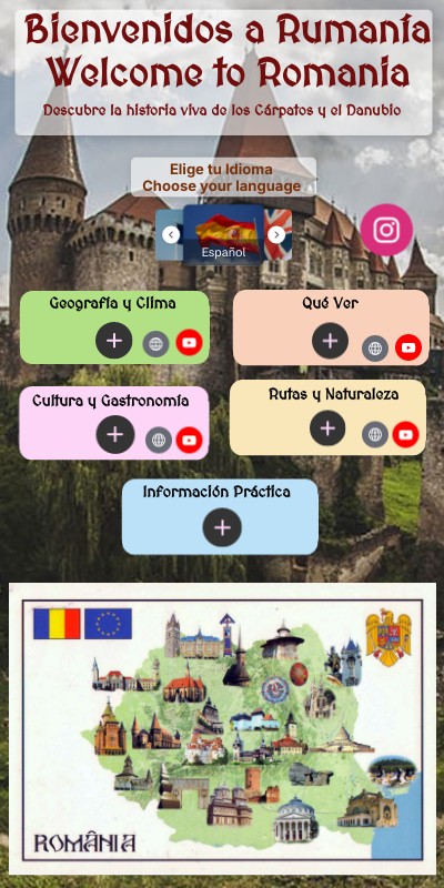 Rumanía está en el sureste de Europa, en la intersección de Europa Central y del Sureste, limitando al este con el Mar Negro, al norte y noreste con Ucrania y Moldavia, al oeste con Hungría y Serbia, y al sur con Bulgaria, con su capital en Bucarest. Es un país con una rica historia, famosa por Transilvania y su herencia latina, miembro de la Unión Europea y la OTAN.