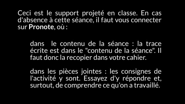 Ceci est le support projeté en classe. En cas d'absence à cette séance, il faut vous connecter sur Pronote, où :