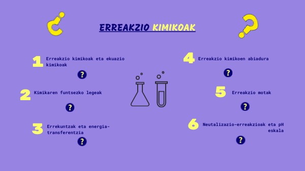 Erreakzio kimiko bat da substantzia batzuk beste batzuk bihurtzen diren prozesua, atomoak berrantolatuz: -Aldaketa kimikoak dira. -"Erreaktiboak" eraldatu "produktuak" sortzeko. -Formula eta propietate kimikoak desberdinak dira. -Ekuazio kimikoen bidez adierazten dira. -Aldaketa kimiko nabarmenak: gasak, kea, argia sortzea,... Talken teoria: 1-Erreaktibo partikuak elkarren kontra talka egiten dute. 2-Geroago, loturak apurtzen dira. 3-Azkenik, atomoak berrantolatu eta lotura berriak sortzen dira. Itzulgarritasuna: -Erreakzio itzulezina: noranzko bakarrean gertatzen da . -Erreakzio itzulgarria: bi noranzkoetan gertatzen da. Oreka kimikoa: -Erreakzio zuzenaren eta alderantzizkoaren abiadurak berdinak direnean, kontzentrazioak konstante mantentzen dira.