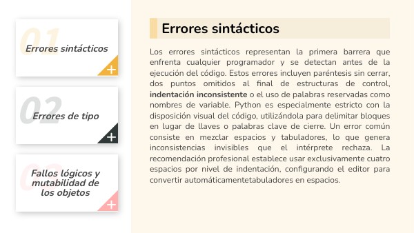 Los errores sintácticos representan la primera barrera que enfrenta cualquier programador y se detectan antes de la ejecución del código. Estos errores incluyen paréntesis sin cerrar, dos puntos omitidos al final de estructuras de control, indentación inconsistente o el uso de palabras reservadas como nombres de variable. Python es especialmente estricto con la disposición visual del código, utilizándola para delimitar bloques en lugar de llaves o palabras clave de cierre. Un error común consiste en mezclar espacios y tabuladores, lo que genera inconsistencias invisibles que el intérprete rechaza. La recomendación profesional establece usar exclusivamente cuatro espacios por nivel de indentación, configurando el editor para convertir automáticamentetabuladores en espacios.