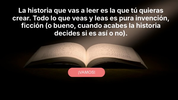 La historia que vas a leer es la que tú quieras crear. Todo lo que veas y leas es pura invención, ficción (o bueno, cuando acabes la historia decides si es así o no).