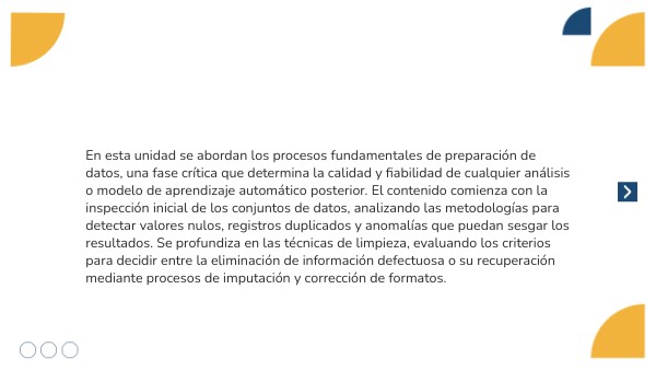 En esta unidad se abordan los procesos fundamentales de preparación de datos, una fase crítica que determina la calidad y fiabilidad de cualquier análisis o modelo de aprendizaje automático posterior. El contenido comienza con la inspección inicial de los conjuntos de datos, analizando las metodologías para detectar valores nulos, registros duplicados y anomalías que puedan sesgar los resultados. Se profundiza en las técnicas de limpieza, evaluando los criterios para decidir entre la eliminación de información defectuosa o su recuperación mediante procesos de imputación y corrección de formatos.