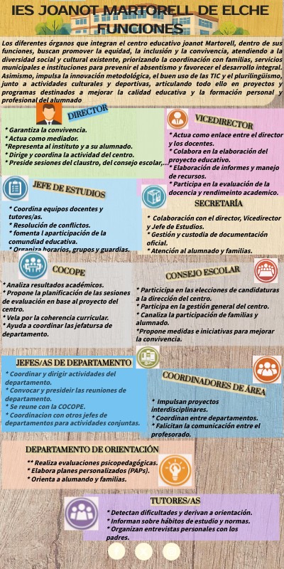 Los diferentes órganos que integran el centro educativo joanot Martorell, dentro de sus funciones, buscan promover la equidad, la inclusión y la convivencia, atendiendo a la diversidad social y cultural existente, priorizando la coordinación con familias, servicios municipales e instituciones para prevenir el absentismo y favorecer el desarrollo integral. Asimismo, impulsa la innovación metodológica, el buen uso de las TIC y el plurilingüismo, junto a actividades culturales y deportivas, articulando todo ello en proyectos y programas destinados a mejorar la calidad educativa y la formación personal y profesional del alumnado