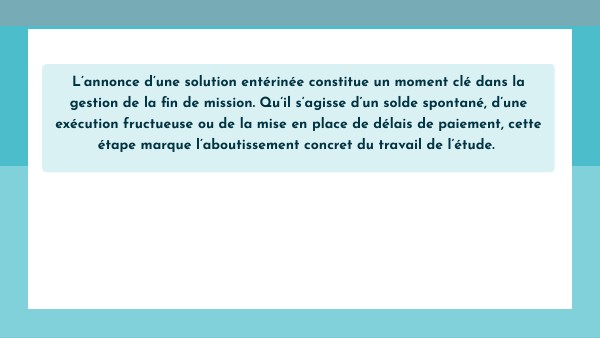 L’annonce d’une solution entérinée constitue un moment clé dans la gestion de la fin de mission. Qu’il s’agisse d’un solde spontané, d’une exécution fructueuse ou de la mise en place de délais de paiement, cette étape marque l’aboutissement concret du travail de l’étude.