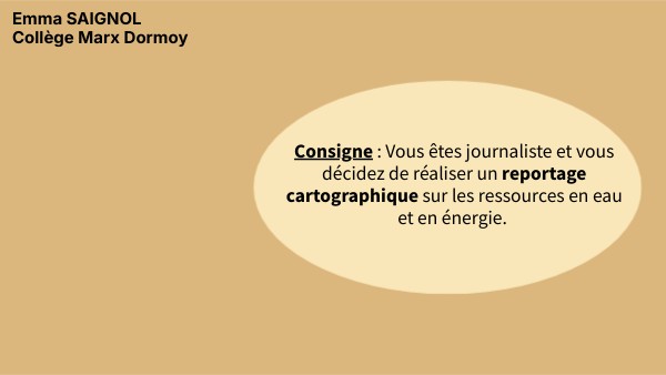Consigne : Vous êtes journaliste et vous décidez de réaliser un reportage cartographique sur les ressources en eau et en énergie.