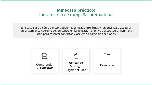 Este caso ilustra cómo alinear decisiones críticas entre áreas y regiones para asegurar un lanzamiento coordinado. Se centra en la aplicación efectiva del Strategic Alignment Loop para resolver conflictos y acelerar la toma de decisiones.