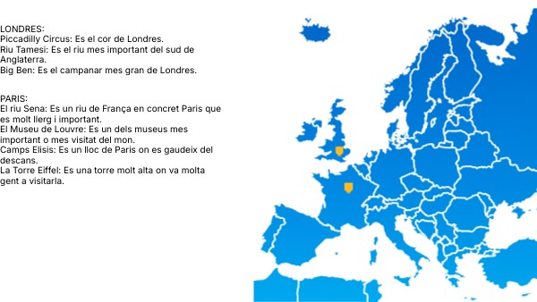 PARIS: El riu Sena: Es un riu de França en concret Paris que es molt llerg i important. El Museu de Louvre: Es un dels museus mes important o mes visitat del mon. Camps Elisis: Es un lloc de Paris on es gaudeix del descans. La Torre Eiffel: Es una torre molt alta on va molta gent a visitarla.