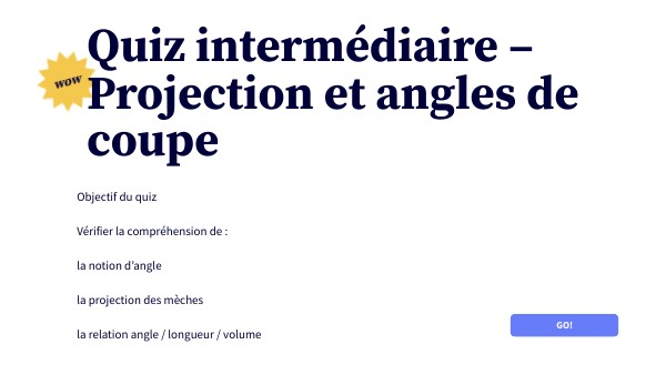 Objectif du quiz Vérifier la compréhension de : la notion d’angle la projection des mèches la relation angle / longueur / volume