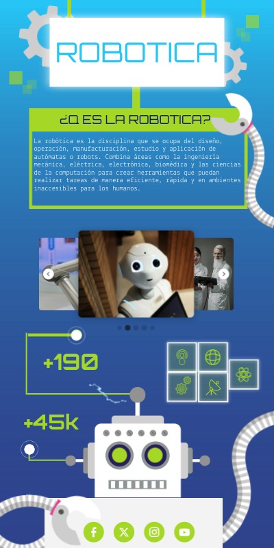 La robótica es la disciplina que se ocupa del diseño, operación, manufacturación, estudio y aplicación de autómatas o robots. Combina áreas como la ingeniería mecánica, eléctrica, electrónica, biomédica y las ciencias de la computación para crear herramientas que puedan realizar tareas de manera eficiente, rápida y en ambientes inaccesibles para los humanos.