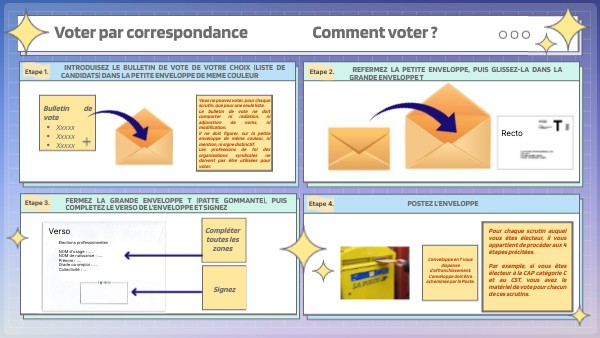 Pour chaque scrutin auquel vous êtes électeur, il vous appartient de procéder aux 4 étapes précitées. Par exemple, si vous êtes électeur à la CAP catégorie C et au CST, vous avez le matériel de vote pour chacun de ces scrutins.
