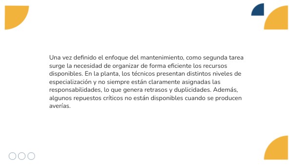 Una vez definido el enfoque del mantenimiento, como segunda tarea surge la necesidad de organizar de forma eficiente los recursos disponibles. En la planta, los técnicos presentan distintos niveles de especialización y no siempre están claramente asignadas las responsabilidades, lo que genera retrasos y duplicidades. Además, algunos repuestos críticos no están disponibles cuando se producen averías.