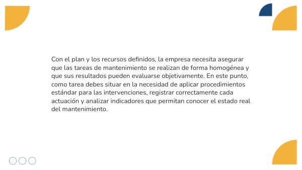 Con el plan y los recursos definidos, la empresa necesita asegurar que las tareas de mantenimiento se realizan de forma homogénea y que sus resultados pueden evaluarse objetivamente. En este punto, como tarea debes situar en la necesidad de aplicar procedimientos estándar para las intervenciones, registrar correctamente cada actuación y analizar indicadores que permitan conocer el estado real del mantenimiento.
