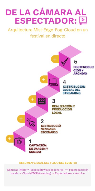 RESUMEN VISUAL DEL FLUJO DEL EVENTO: Cámaras (Mist) → Edge (gateways escenario ) → Fog (realización local) → Cloud (CDN/streaming) → Espectadores + Archivo