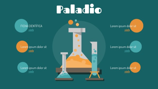 NOMBRE: PaladioSÍMBOLO: Sd NÚMERO ATÓMICO: 46 MASA ATÓMICA: 106.42 GRUPO Y PERIODO: Grupo 10; Periodo 5 TIPO DE ELEMENTO: Metal de transición ESTADO FÍSICO: Sólido ABUNDANCIA/OBTENCIÓN: Escaso, se extrae de algunas minas de cobre y níquel PROPIEDADES PRINCIPALES: -Resistente a la corrosión -Buen conductor -Maleable