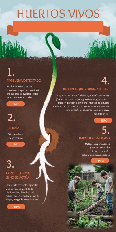 Negocio que ofrece "talleres agrícolas" para niño y jóvenes en huertos que agricultores mayores ya no pueden atender. El agricultor mantiene su huerto cuidado, recibe parte de lo cosechado y comparte sus conocimientos y recuerdos con las nuevas generaciones.