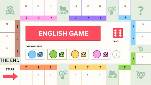 Cada jugador/a debe elegir un color: azul, verde, amarillo o rosa. Así obtiene una ficha para marcar su posición y 10 casas para indicar las propiedades que adquiere a lo largo del juego. Cada jugador debe coger la ficha de su color y colocarla en la casilla de salida. Para empezar a jugar, pincha sobre el dado y mueve tu ficha hasta la casilla que corresponda. En cada casilla debe haber una o varias preguntas. Si la aciertas, coloca una de tus casas en dicha casilla. ¡Enhorabuena, has conseguido una nueva propiedad! Casillas especiales: las casillas con iconos pueden contener sanciones como por ejemplo "El jugador paga impuestos de la luz: pierde 2 casas". ¡Acierta la pregunta para evitar la sanción! Ganará aquel jugador/a que tenga el mayor número de casas sobre el tablero una vez que todas las casillas estén ocupadas.