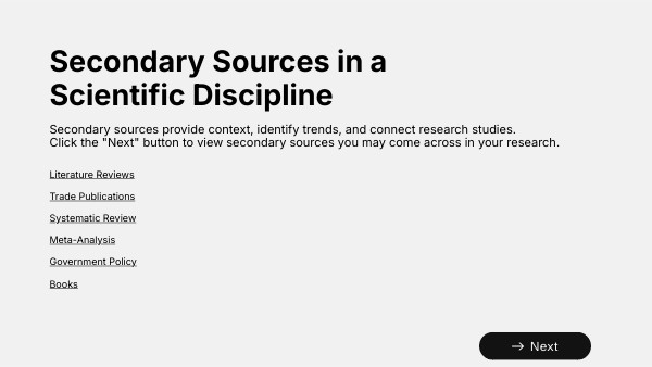 Secondary sources provide context, identify trends, and connect research studies. Click the "Next" button to view secondary sources you may come across in your research.