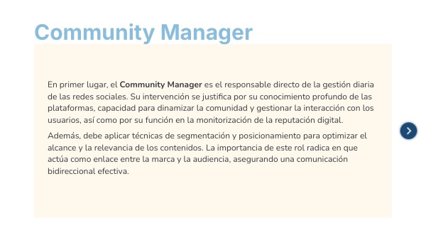 En primer lugar, el Community Manager es el responsable directo de la gestión diaria de las redes sociales. Su intervención se justifica por su conocimiento profundo de las plataformas, capacidad para dinamizar la comunidad y gestionar la interacción con los usuarios, así como por su función en la monitorización de la reputación digital.