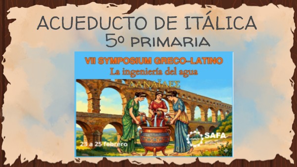 Para el VII Symposium Greco - Latino, organizado en el colegio SAFA Nuestra Señora de Los Reyes, los alumnos y alumnas de 5º de Primaria vamos a explicar qué es un acueducto, sus usos y su importancia en la antigua Roma. Además, vamos a explicar la importancia del acueducto de Itálica