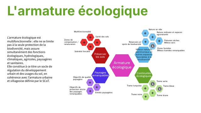 L’armature écologique est multifonctionnelle : elle ne se limite pas à la seule protection de la biodiversité, mais assure simultanément des fonctions écologiques, hydrologiques, climatiques, agricoles, paysagères et sanitaires.