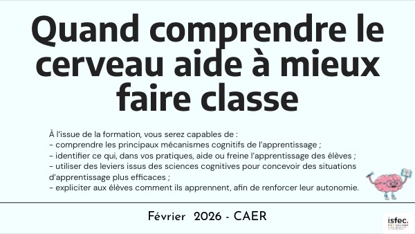 À l’issue de la formation, vous serez capables de : - comprendre les principaux mécanismes cognitifs de l’apprentissage ; - identifier ce qui, dans vos pratiques, aide ou freine l’apprentissage des élèves ; - utiliser des leviers issus des sciences cognitives pour concevoir des situations d’apprentissage plus efficaces ; - expliciter aux élèves comment ils apprennent, afin de renforcer leur autonomie.