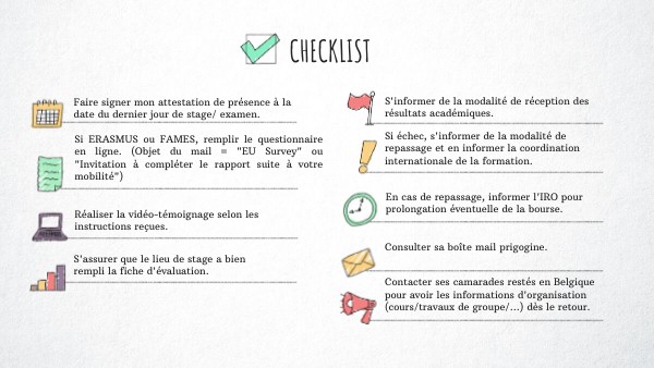 Contacter ses camarades restés en Belgique pour avoir les informations d'organisation (cours/travaux de groupe/...) dès le retour.