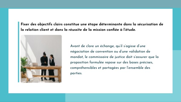 Fixer des objectifs clairs constitue une étape déterminante dans la sécurisation de la relation client et dans la réussite de la mission confiée à l’étude.
