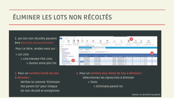 1. Les lots non récoltés peuvent être éliminés manuellement : Pour ce faire, rendez-vous sur : > Lot Lists > Line Harvest Plot Lists > Ouvrez votre plot list