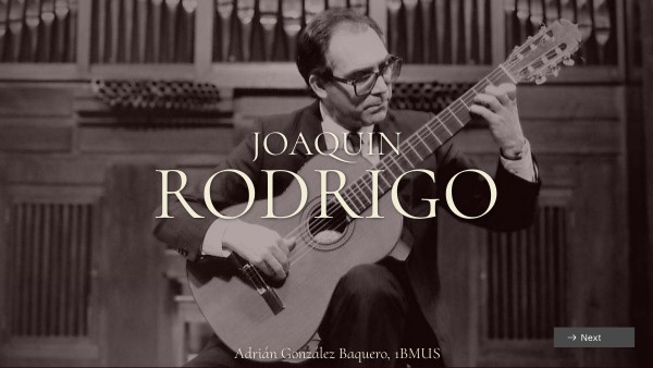Joaquín Rodrigo was one of the most important Spanish composers of the twentieth century. He was born in 1901 in Sagunto, a town near Valencia, Spain. When he was only three years old, he lost his sight due to illness, but this did not stop him from pursuing a life in music. He studied first in Spain and later in Paris, where he developed his musical style and connected with important musicians of the time. Rodrigo became known for composing music that beautifully reflects the spirit, traditions, and landscapes of Spain. He had a special ability to blend classical forms with Spanish folk melodies and rhythms, creating a sound that was elegant, expressive, and full of national character. Even though he was blind, he composed with the help of assistants, to whom he dictated every note from memory and imagination.