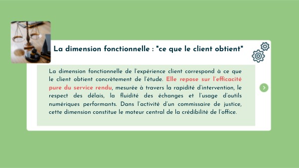 La dimension fonctionnelle de l’expérience client correspond à ce que le client obtient concrètement de l’étude. Elle repose sur l’efficacité pure du service rendu, mesurée à travers la rapidité d’intervention, le respect des délais, la fluidité des échanges et l’usage d’outils numériques performants. Dans l’activité d’un commissaire de justice, cette dimension constitue le moteur central de la crédibilité de l’office.