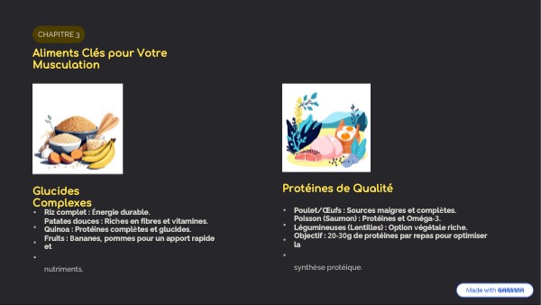 Poulet/Œufs : Sources maigres et complètes.Poisson (Saumon) : Protéines et Oméga-3.Légumineuses (Lentilles) : Option végétale riche.Objectif : 20-30g de protéines par repas pour optimiser la