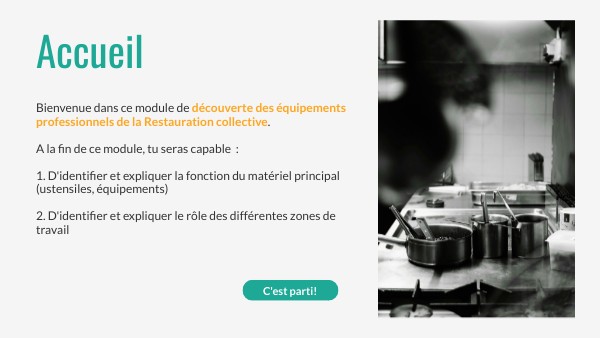 Bienvenue dans ce module de découverte des équipements professionnels de la Restauration collective. A la fin de ce module, tu seras capable : 1. D'identifier et expliquer la fonction du matériel principal (ustensiles, équipements) 2. D'identifier et expliquer le rôle des différentes zones de travail