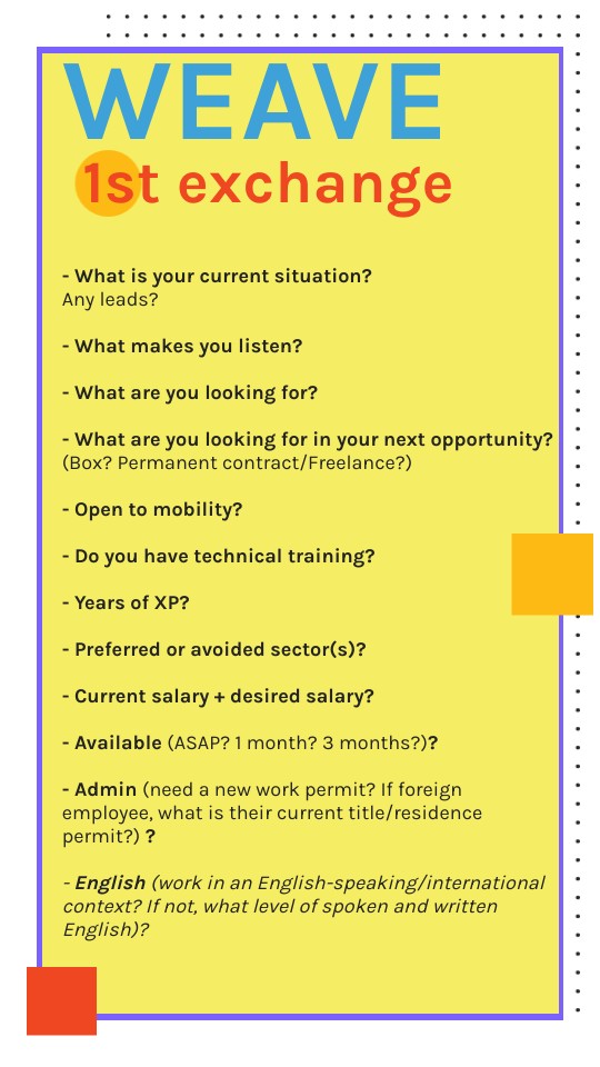 - What is your current situation?Any leads? - What makes you listen? - What are you looking for? - What are you looking for in your next opportunity? (Box? Permanent contract/Freelance?) - Open to mobility? - Do you have technical training? - Years of XP? - Preferred or avoided sector(s)? - Current salary + desired salary? - Available (ASAP? 1 month? 3 months?)? - Admin (need a new work permit? If foreign employee, what is their current title/residence permit?) ? - English (work in an English-speaking/international context? If not, what level of spoken and written English)?