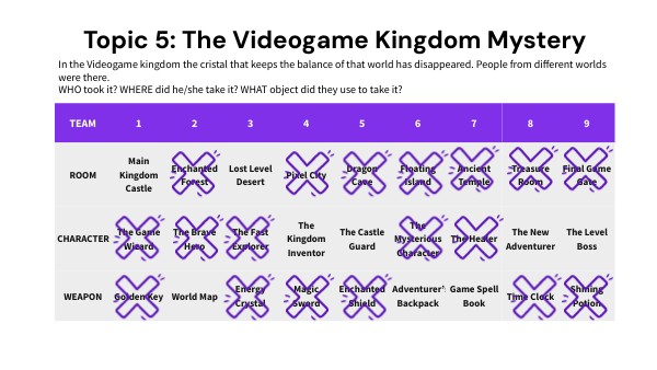For all the situations, every team must create in the same presentation: - ROOM: Description and drawing or image. - CHARACTER: Description, History and Image/Drawing. - WEAPON/OBJECT: Relation to the mystery case and Image/Drawing. For example, Team 1 will have to create Main Kingdom castle (ROOM); The game wizard (CHARACTER) and a Golden Key (OBJECT) All these can be shown in a 3 slide Canva presentation, They can find it in their corresponding Forum.