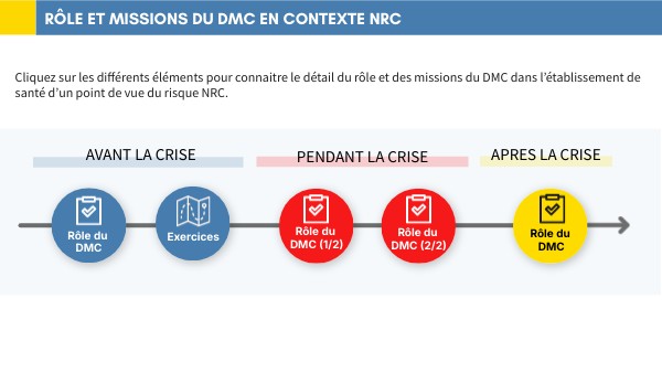 Cliquez sur les différents éléments pour connaitre le détail du rôle et des missions du DMC dans l’établissement de santé d’un point de vue du risque NRC.