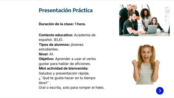 Contexto educativo: Academia de español. (ELE). Tipos de alumnos: jóvenes estudiantes. Nivel: A1. Objetivo: Aprender a usar el verbo gustar para hablar de aficiones. Mini actividad de bienvenida: Saludos y presentación rápida. ¿¨Qué te gusta hacer en tu tiempo libre?¨. Oral o escrita, solo para romper el hielo.