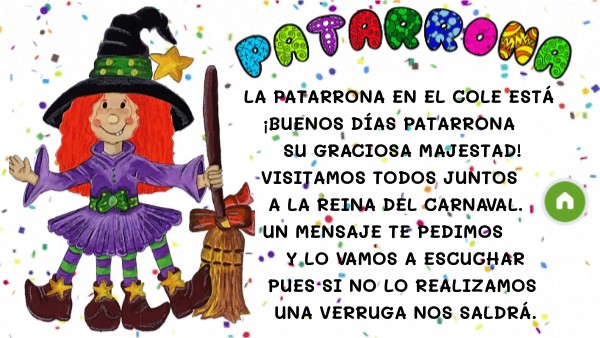LA PATARRONA EN EL COLE ESTÁ ¡BUENOS DÍAS PATARRONA SU GRACIOSA MAJESTAD! VISITAMOS TODOS JUNTOS A LA REINA DEL CARNAVAL. UN MENSAJE TE PEDIMOS Y LO VAMOS A ESCUCHAR PUES SI NO LO REALIZAMOS UNA VERRUGA NOS SALDRÁ.