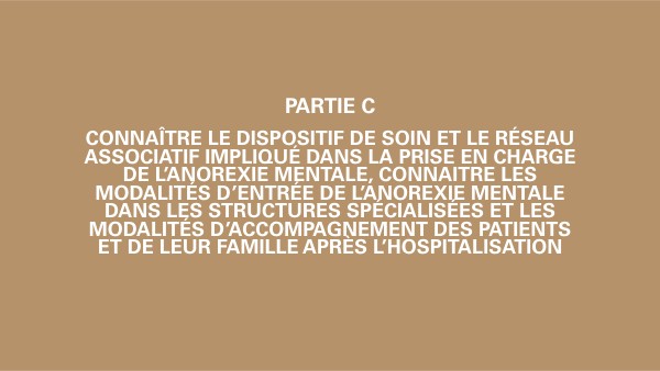 Connaître le dispositif de soin et le réseau associatif impliqué dans la prise en charge de l’anorexie mentale, connaitre les modalités d’entrée de l’anorexie mentale dans les structures spécialisées et les modalités d’accompagnement des patients et de leur famille après l’hospitalisation