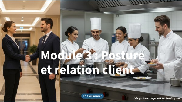 Bienvenue dans ce troisième module ! Aujourd'hui nous allons découvrir pourquoi votre comportement est la clé de votre réussite. Saviez-vous que dans l'hôtellerie et la restauration, la première impression est essentielle ?Dans ce secteur, votre personnalité est un atout professionnel. Dès que vous entrez dans une salle ou une chambre, vous représentez votre établissement. C'est ce qu'on appelle l'image de marque. Votre attitude et votre personnalité ne sont donc pas seulement une question de politesse ou un simple trait de caractère. C'est votre outil de travail professionnel. Dans ce module, vous allez apprendre à : 1. Expliquer le lien entre votre comportement professionnel et l'image de marque de l'établissement. 2. Identifier les bons gestes et la tenue adaptée à votre métier. 3. Différencier les attitudes professionnelles des comportements inadaptés. 4. Sélectionner la réponse adaptée pour désamorcer un conflit avec un client mécontent.