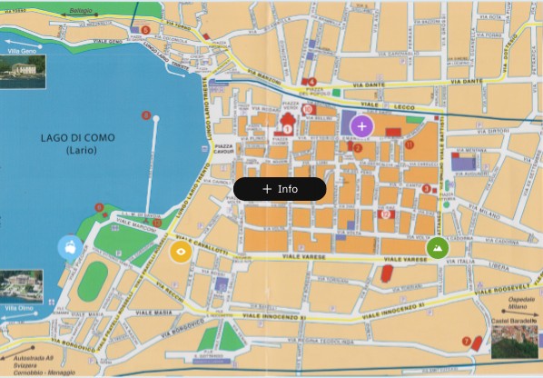 La ciudad de Como, situada a orillas del lago de Como, destaca por su riqueza histórica y artística. Entre sus principales monumentos se encuentran el Tempio Voltiano, dedicado a Alessandro Volta, el Monumento ai Caduti, una torre conmemorativa, y el Castello Baradello, desde donde se puede disfrutar de vistas panorámicas. El centro de la ciudad se articula alrededor de plazas como la Piazza Cavour, que da ha el lago, y la Piazza San Fedele, de ambiente histórico. En el ámbito religioso, destaca el Duomo di Como, una imponente catedral, junto a la Basilica di San Fedele, representativa del estilo románico.