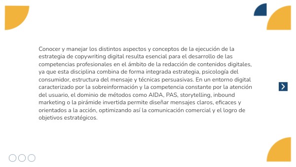 Conocer y manejar los distintos aspectos y conceptos de la ejecución de la estrategia de copywriting digital resulta esencial para el desarrollo de las competencias profesionales en el ámbito de la redacción de contenidos digitales, ya que esta disciplina combina de forma integrada estrategia, psicología del consumidor, estructura del mensaje y técnicas persuasivas. En un entorno digital caracterizado por la sobreinformación y la competencia constante por la atención del usuario, el dominio de métodos como AIDA, PAS, storytelling, inbound marketing o la pirámide invertida permite diseñar mensajes claros, eficaces y orientados a la acción, optimizando así la comunicación comercial y el logro de objetivos estratégicos.