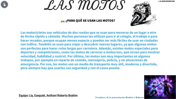 Por último, las motos son muy importantes en algunos trabajos, por ejemplo en reparto de comida, mensajería, policía, y en situaciones de emergencia. Por eso, las motos son un medio de transporte muy útil, moderno y divertido, pero siempre hay que usarlas con seguridad y con el casco puesto.