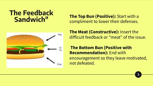 The Top Bun (Positive): Start with a compliment to lower their defenses. The Meat (Constructive): Insert the difficult feedback or "meat" of the issue. The Bottom Bun (Positive with Recommendation): End with encouragement so they leave motivated, not defeated.